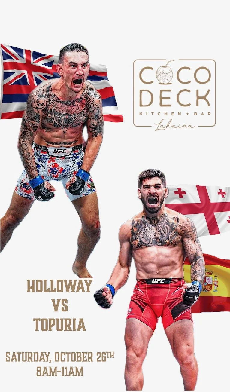Get ready, fight fans! Coco Deck Lahaina is excited to announce that we’ll be showing UFC 308: Topuria vs. Holloway live on Saturday, October 26th! We’re opening our doors early at 8:30 AM so you can grab the best seat in the house, enjoy great food and drinks, and experience all the thrilling action of this highly anticipated fight card.
